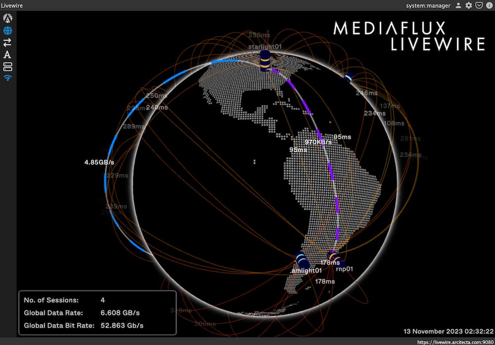 Using parallel TCP/IP protocols to minimize network administration overhead, Livewire can be deployed as a stand-alone solution to directly replace other network transmission tools. With these enhancements, the system can scale from the smallest and most unreliable networks to networks of hundreds of gigabits to terabits per second. Livewire is integrated within the Mediaflux metadata-driven ecosystem, allowing all Mediaflux systems and capabilities to seamlessly work together across different network topologies. Users and systems can leverage the power of metadata to orchestrate the flow of data around the globe securely. Mediaflux knows exactly where all data is located and who transmitted the data. This global visualization of data flows is unique to Mediaflux and highlights Arcitecta’s expertise in geospatial data management and ability to deliver a view of all data presence points.