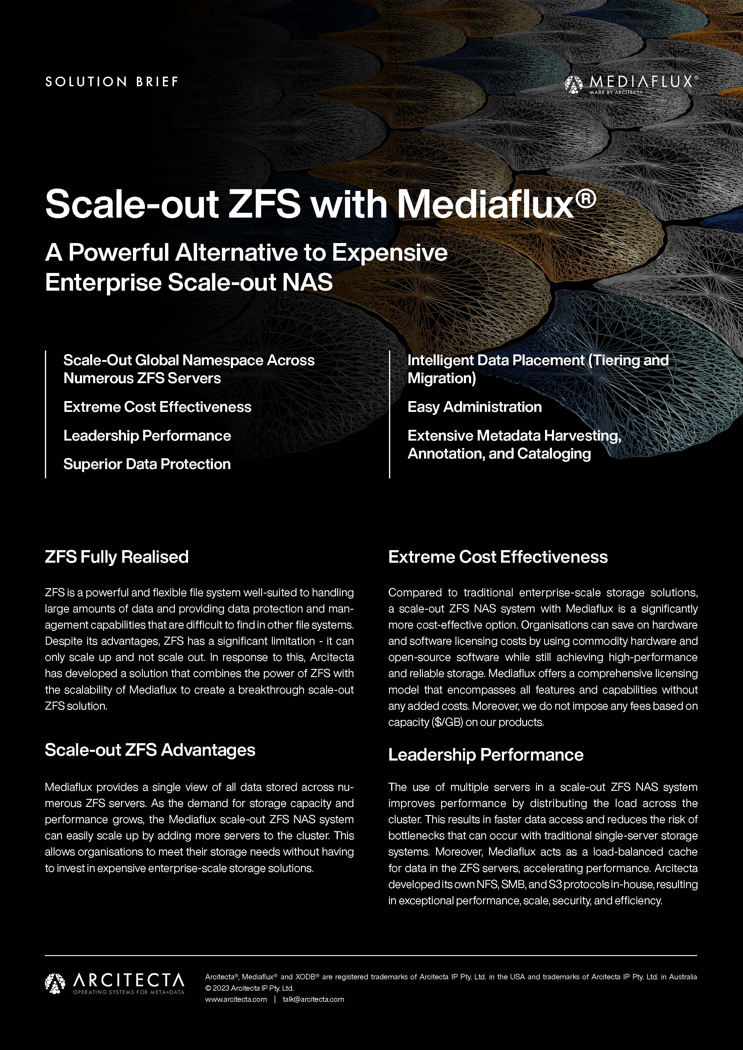 ZFS is a powerful and flexible file system well-suited to handling large amounts of data and providing data protection and management capabilities that are difficult to find in other file systems. Despite its advantages, ZFS has a significant limitation - it can only scale up and not scale out. In response to this, Arcitecta has developed a solution that combines the power of ZFS with the scalability of Mediaflux to create a breakthrough scale-out ZFS solution.